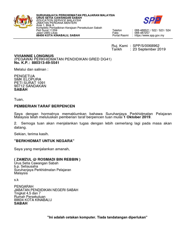 Surat Pemberian Taraf Berpencen By Ra_Daniela5 01 Sep, 2022 Post a Comment Pemberian Taraf Berpencen Pendidik2u Surat Pemberian Taraf Berpencen Letter 7saudara Com Viral Oh Viral Alhamdulillah Satel Pengurusan Kwsp Bgi Facebook Borang Pemberian Taraf Berpencen Surat Pemberian Taraf Berpencen Terbaru Letter Website Share No comments for "Surat Pemberian Taraf Berpencen"